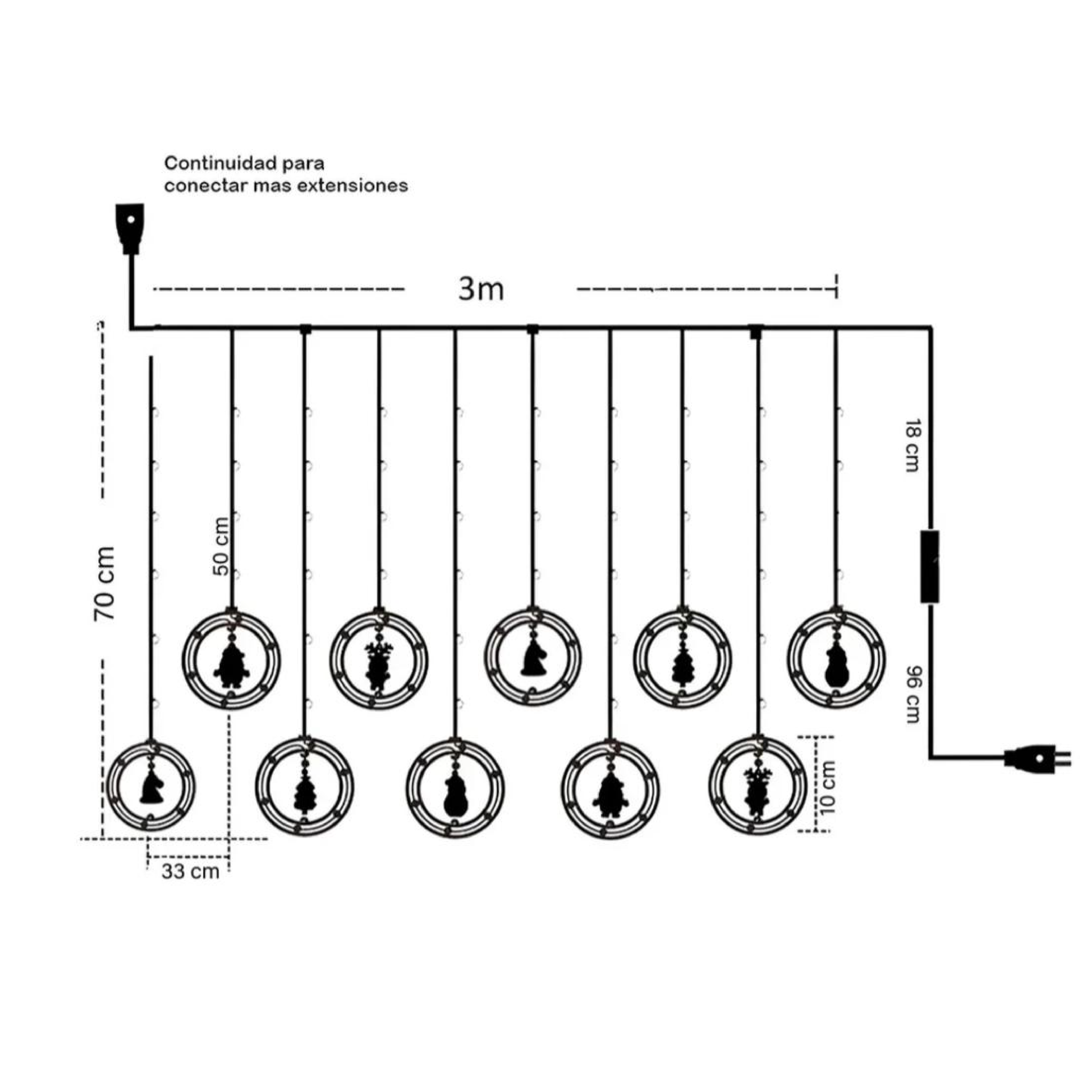Cortina Aros 3M Navidad 100 LEDS blancaLargo: 3 m / Cantidad de tiras: 10 tiras / Caída de la tira: Larga: 70 cm - Corta: 50 cm / Cantidad de luces: 100 LEDS. / Distancia entre tiras: 33 cm.